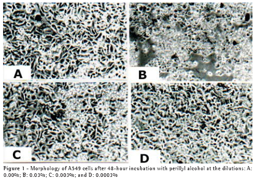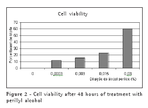 Cell viability was quantified using [3-(4,5-dimethylthiazol-2-yl)-2,5 diphenyltetrazolium bromide] assays (MTT method) as described by Mosmann.(10) In summary, 104 cells/well were grown in 96-well plates, which, 24 hours later, were incubated with perillyl alcohol at the various dilutions previously cited. After 24 hours of incubation, 20 µL of MTT (5µg/mL) were added to each well, and cells were incubated in total darkness at 37°C for 4 hours. The supernatant was then discarded and the precipitate was suspended in 150 µL of dimethyl sulfoxide. The microplates were read with a BenchMark ELISA reader (BioRad, Hercules, CA, USA) at 570-nm using a 630-nm reference filter.