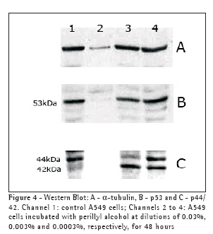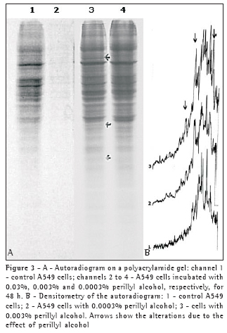 Objetivo: Estudar a ação do álcool perílico na expressão gênica de células de adenocarcinoma de pulmão humano. Métodos: Incubaram-se células de adenocarcinoma de pulmão com álcool perílico em diluições que variaram entre 0,03% e 0,0003% por 48 horas. Observaram-se as alterações na morfologia celular e quantificou-se a viabilidade celular pelo método do MTT (3-(4,5-dimetiltiazol-2-yl)-2,5 difeniltertrazolim brometo). Analisou-se a síntese de proteínas das amostras previamente marcadas radioativamente com 35S, através de eletroforese em gel de poliacrilamida. Determinou-se a expressão das proteínas p53 e p42/44 através do método de Western Blot. Resultados: Após 48 horas de incubação, observaram-se alterações na morfologia celular para a diluição de 0,03% de álcool perílico, as quais foram pouco verificadas em diluições superiores a 0,003%. A inibição da viabilidade celular foi de 60,17% (p < 0,001), 15,62% (p < 0,001) e 11,53% (p < 0,05) para as diluições de 0,03%, 0,003% e 0,0003% de álcool perílico, respectivamente. Os resultados mostram a indução de proteínas de 110 kDa, 42 kDa e 28 kDa. Não se observou variação estatisticamente significativa para a expressão da proteína p53. Em comparação com a expressão de a-tubulina, a diluição de 0,003% de álcool perílico provocou uma diminuição marcante da fosforilação da p44 e um aumento da fosforilação da p42. Conclusão: Os resultados apresentados sugerem novos caminhos metabólicos da ação do álcool perílico em células de adenocarcinoma de pulmão humano.