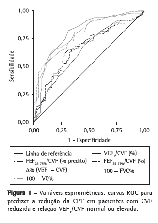Usando tabelas de contingência 2 × 2, resultados verdadeiro-positivos (sensibilidade) e falso-positivos (1 − especificidade) foram calculados para diversos pontos de corte de CVF: resultados verdadeiro-positivos sendo aqueles associados ao padrão restritivo (CPT reduzida) e resultados falso-positivos sendo aqueles associados ao padrão inespecífico (CPT normal). Os resultados e os pontos de corte para CVF% são apresentados na Tabela 3, bem como a diferença percentual entre VEF1 e CVF, além da alta probabilidade clínica.