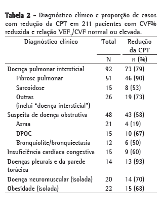 Pacientes com CPT normal foram classificados como apresentando um padrão inespecífico, ao passo que aqueles com CPT reduzida foram classificados como apresentando um padrão restritivo.