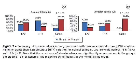 According to the randomization, perfusion was achieved with 20 mL of LPD solution (Perfadex®; Vitrolife, Kungsbacka, Sweden), HTK solution (Custodiol®; Franz Kohler Chemie GMBH, Bensheim, Germany), or NS, at 4°C, administered under a constant pressure of 20 cmH2O by raising the flask. At the end of the perfusion, the heart-lung block was extracted and preserved for 6 h or 12 h, according to the predetermined randomization, being prepared and connected to the ex vivo lung perfusion system (IL2 - Isolated Perfused Rat or Guinea Pig Lung System; Harvard Apparatus, Holliston, MA, USA; Hugo Sachs Elektronik, Hugstetten, Germany). The block was reperfused with homologous blood obtained from 3 similarly anesthetized animals, and the volume was increased by adding enough NS to achieve a hematocrit of 15-20%. Reperfusion was performed via cannulation of the pulmonary artery/left atrium and tracheal ventilation for 60 min. The circuit was filled with blood, which was heated and recirculated through the system for 10 min with a gas mixture (90% nitrogen and 10% carbon dioxide at a flow of 200 mL/min) administered through a membrane oxygenator (D150 MediSulfone® Hemofilter; MEDICA s.r.l. Medolla, Italy). The heart-lung block was perfused (5-7 mL/min) and ventilated (tidal volume = 10 mL/kg, RR = 70 breath/min, and PEEP = 3 cmH2O). After 5-10 min, we started data collection, which was performed every 10 min for 60 min. We collected data on hemodynamics and respiratory mechanics, as well as blood gas analysis (ABL 800; Radiometer, Copenhagen, Denmark) results. At the end of the reperfusion, fragments of the middle lobe were extracted, fixed in 4% formaldehyde buffered solution, and embedded in paraffin blocks. Subsequently, 5-µm sections were cut and stained with H&E. We conducted a qualitative and semi-quantitative analysis by assessing the following: congestion; alveolar edema; alveolar hemorrhage; interstitial hemorrhage; inflammatory infiltrate; and interstitial infiltrate. For the semi-quantitative assessment of changes such as alveolar hemorrhage, interstitial hemorrhage, interstitial inflammatory infiltrate and congestion, we considered the histological compartmentalization, i.e., alveolar spaces, (axial, septal, and peripheral) interstitium, capillary bed, and extent of changes. Each change (event) was separately semi-quantified and received a score ranging from zero to three, as follows: no event (score 0); event occurring in less than 33% of the affected compartments (score 1); event occurring in 33-66% of the affected compartments (score 2); and event occurring in more than 66% of the affected compartments (score 3).(13) Histological examination was performed by a single observer. The parameter "edema" was evaluated in two different compartments, namely the interstitial compartment and the bronchoalveolar compartment. Alveolar edema was scored with the semi-quantitative scoring system described above.