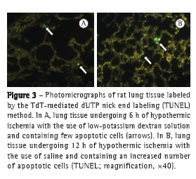 Apoptosis was assessed using the TdT-mediated dUTP nick end labeling (TUNEL) method. The fragments of the middle lobe were processed in accordance with the instructions provided in the In Situ Cell Death Detection kit (Roche Diagnostics GmbH, Mannheim, Germany) and the methods described by Gavrieli et al.(14) and Rösl.(15) After deparaffinization in xylene, slides were pretreated with proteinase K (20 mg/mL) for 30 min in a humidified chamber at room temperature, washed in PBS, and treated with a solution of 3% oxygen peroxide in methanol for 30 min at room temperature. Subsequently, the fragments were washed in PBS twice, and, after the area around the sample was dried, 50 µL of the TUNEL reaction mixture-5 µL of the enzyme solution (violet tube) and 45 µL of the labeling solution (blue tube)-were added to each lung fragment, followed by incubation under Parafilm for 60 min in a humidified chamber at 37°C. The assay is employed to label DNA strand breaks (with TdT) in each fragment. The assay catalyzes the polymerization of labeled nucleotides at the 3'-OH ends of DNA independently (TUNEL reaction) per sample, therefore allowing the detection of DNA strand breaks in the early stages of lung cell apoptosis. After the incubation period (TUNEL reaction), the slides were washed in PBS three times (2 min each). The area around the fragment was dried, and the slides were mounted with glycerin solution and PBS (1:1), were coverslipped and protected from light, and were immediately analyzed under a fluorescence microscope (Carl Zeiss, Oberkochen, Germany), through which labeled apoptotic cells were quantified in five random fields (magnification, ×40). The readings were performed by two investigators, who were blinded to the TUNEL reaction quantification. Microscopic field selection was random, the microscopic fields being always in the alveolar region. Five microscopic fields were selected, as it is done when reading H&E-stained slides. The identified cells were specific, and counts included the total number of cells in the selected region.