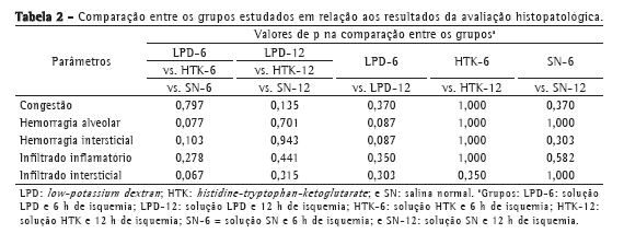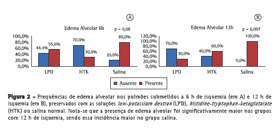 Conforme a randomização, foram utilizados para perfusão 20 mL de solução LPD (Perfadex®; Vitrolife, Kungsbacka, Suécia), HTK (Custodiol®; Franz Kohler Chemie GMBH, Bensheim, Alemanha) ou SN a 4°C, administradas sob pressão constante de 20 cmH2O por elevação do frasco. Ao término da perfusão, o bloco cardiopulmonar foi extraído e acondicionado a 4°C durante o tempo de isquemia pré-determinado pela randomização, sendo preparado e conectado ao sistema de perfusão ex-vivo (IL2 - Isolated Perfused Rat or Guinea Pig Lung System; Harvard Apparatus, Holliston, MA, EUA; Hugo Sachs Elektronik, Hugstetten, Alemanha). O bloco foi perfundido com sangue homólogo obtido de 3 animais anestesiados de forma similar, e o volume foi acrescido de soro fisiológico 0,9% na quantidade suficiente para obter-se hematócrito em 15-20%. A reperfusão foi realizada por canulação da artéria pulmonar/átrio esquerdo e ventilação pela traqueia durante 60 min. O circuito foi preenchido com o sangue, aquecido, recirculado no sistema por 10 min com mistura gasosa (nitrogênio 90%, dióxido de carbono 10% e fluxo de 200 mL/min) utilizando um desoxigenador de membrana (D150 MediSulfone® Hemofilter; MEDICA s.r.l. Medolla, Itália). O bloco cardiopulmonar foi perfundido (5-7 mL/min) e ventilado (volume corrente = 10 mL/kg, FR = 70 ciclos/min e PEEP = 3 cmH2O). Após 5-10 min, iniciou-se a coleta de dados, realizada em intervalos de 10 min, durante 60 min. Coletaram-se dados de hemodinâmica, mecânica ventilatória e hemogasometria, utilizando um equipamento ABL 800 (Radiometer, Copenhagen, Dinamarca). Ao término da reperfusão, fragmentos do lobo médio foram extraídos, fixados em formaldeído a 4% em solução tamponada e incluídos em blocos de parafina, sendo realizados cortes de 5 µm corados com H&E. Foi realizada uma análise qualitativa e semiquantitativa baseada na avaliação de congestão, edema alveolar, hemorragia alveolar, hemorragia intersticial, infiltrado inflamatório e infiltrado intersticial. Para a avaliação semiquantitativa de alterações, como hemorragia alveolar, hemorragia intersticial, infiltrado inflamatório intersticial e congestão, foi considerada a compartimentalização histológica, ou seja, espaços alveolares, interstício (axial, septal e periférico), leito capilar e extensão das alterações. Cada alteração (evento) foi semiquantificada separadamente, e a cada uma foi atribuído um escore de zero a três conforme a sua correspondência: evento ausente (escore 0); evento presente em menos de 33% dos compartimentos acometidos (escore 1); evento presente em 33-66% dos compartimentos acometidos (escore 2); e evento presente em mais de 66% dos compartimentos acometidos (escore 3).(13) A análise histológica foi feita por um único observador. O parâmetro "edema" foi avaliado em dois diferentes compartimentos: intersticial e broncoalveolar. Ao edema alveolar, foi atribuído um escore conforme a semiquantificação acima descrita.