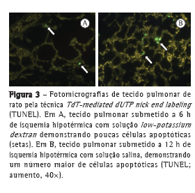 Há, no entanto, evidências inequívocas de que a isquemia por si não é suficiente para desencadear a apoptose. Isso foi demonstrado em cardiomiócitos, nos quais a isquemia sem reperfusão levava apenas a morte celular por necrose. Burns et al. estudaram a apoptose através do método TUNEL antes e após a reperfusão em transplante renal, verificando que a apoptose fora menor na pré-reperfusão e sugerindo que a apoptose ocorreria predominantemente após a reperfusão do órgão.(28) A indução de isquemia pulmonar por ligadura da artéria pulmonar em suínos resultou em isquemia pulmonar crônica e indução de superexpressão de fatores pró-apoptóticos. A adição de reperfusão após isquemia crônica desencadeia apoptose maciça, levando a lesão endotelial.(29) Vários estudos demonstraram que a inibição da apoptose pela ação de drogas inibidoras das caspases resulta em diminuição da infiltração de linfócitos e morte celular, levando a melhora da função pulmonar.(6,30)