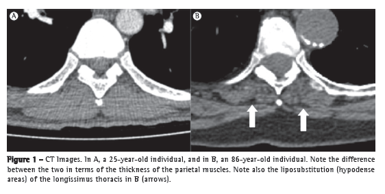 One of the most common imaging findings in the aging chest wall is a reduction in the thickness of the parietal muscles, particularly when compared with that of those in younger individuals, a change that can be easily seen on CT scans (Figure 1). This reduction is one of the major causes of increased pulmonary transparency on chest X-rays in the elderly. Although no studies have established the age at which this finding is first seen, this is known to be due to aging-related muscle mass loss, becoming more pronounced with age.(4-10) However, there are no objective criteria for the diagnosis of this imaging finding. Another common finding is costal cartilage calcification, which is seen as small islands of compact bone tissue or as nodules, being mistaken for solitary pulmonary nodules in some cases.(3)