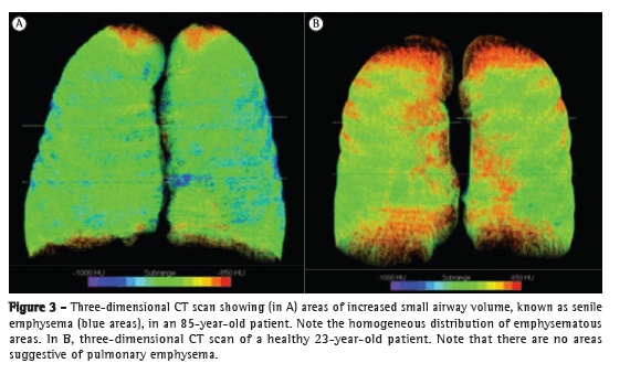 Morphometric studies have shown a progressive increase in the average distance between air space walls, as well as a decrease in the surface area of air space wall per unit of lung volume.(34,39,40) These changes begin in the third decade of life and progress linearly and continuously, resulting in a 25-30% decrease in the surface area of air space wall per unit of lung volume in nonagenarians.(39,40) Although these changes are histologically different from those seen in pulmonary emphysema, in which there is destruction of the alveolar walls, they result in similar changes in lung compliance. As occurs with pulmonary emphysema, these changes cause a reduction in the supporting tissues around the airways, where there is a trend toward collapse of small (< 2-mm) airways and, consequently, changes in airflow. These morphostructural changes in the lung parenchyma constitute an aging-related phenomenon that has been designated "senile emphysema" (Figure 3).(38)