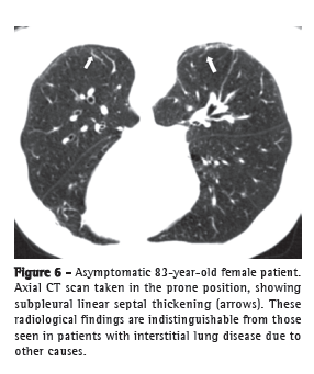 A CT scan of the lung parenchyma shows findings that are quite common in the elderly, and it is speculated that these findings are related to collagen changes. These findings are laminar atelectasis, mostly posterior and basal, located in the dependent regions of the lungs (Figure 5); subpleural linear thickening (Figure 6); areas of air trapping (Figure 7); bronchial thickening and ectasia (Figure 8); and lung cysts.(41,50-53)