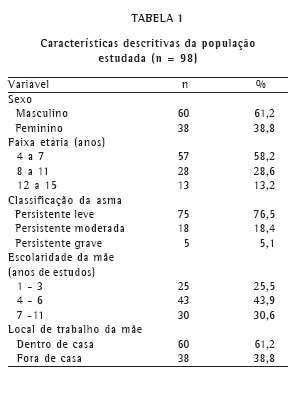 RESULTADOS A Tabela 1 apresenta as características gerais da população estudada. Das 98 crianças e adolescentes incluídos no estudo, houve predominância do sexo masculino (61,2%), da faixa etária de quatro a sete anos (58,2%) e da forma persistente leve da asma (76,5%). A escolaridade média da mãe foi de cinco anos de estudo e, quanto à sua profissão, a maioria ocupava-se com os afazeres domésticos na própria casa (61,2%). Dentre aquelas que trabalhavam fora, 19,4% eram empregadas domésticas.