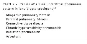 When a biopsy is performed, the usual interstitial pneumonia (UIP) histopathologic pattern (Figure 2) in at least one specimen is necessary to make a definitive diagnosis of IPF. Care must be exercised to rule out alternative clinical explanations for this UIP-pattern as it is not unique to IPF (Chart 2).