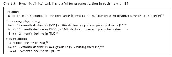 Dynamic clinical variables. Changes in clinical variables over time have shown to be useful predictors of outcome (Chart 3). It has been known for a number of years that a response to therapy over an initial three- to six-month observation period (as measured by symptoms, radiology, and physiology) is associated with prognosis.(9) Now, further investigation has shown that changes in dyspnea or easily measured pulmonary physiology perform well-significantly better than baseline values-in predicting survival.