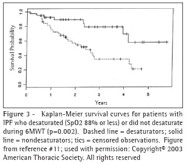 In a study of 83 patients, including 22 with IPF, Lama et al., revealed the prognostic value of desaturation during a 6MWT.(6) Among subjects with IPF whose peripheral oxygen saturation (SpO2) fell to 88% or less ("desaturators") during the 6MWT on room air, the four-year survival rate was 34.5%. This contrasts with a four-year survival rate was 69.1% in those who did not desaturate (Figure 3). IPF desaturators experienced a greater than four-fold hazard of death compared with "non-desaturators." When desaturation status was included in a multivariable model, age, gender, history of smoking, diffusing capacity for carbon monoxide (DlCO), forced vital capacity (FVC), and resting saturation were not independent predictors of survival. The severity of desaturation also appears to predict survival.(7)