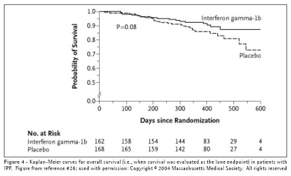 Interferon-gamma 1b. Interferon-gamma 1b (IFN-g) is a cytokine produced by T lymphocytes and natural killer cells.(36) It has several anti-fibrotic properties, such as an inhibitory effect on fibroblast proliferation and activation,(37-38) including that which is induced by TGF-b.(39) Early clinical evidence suggesting that IFN-g might be a useful therapy for patients with IPF appeared in a small, randomized, prospective trial in which 18 IPF patients received prednisone 7.5mg daily and either 200mcg of IFN-g subcutaneously three times weekly or matching placebo.(40) The results revealed significant and clinically meaningful improvements in pulmonary physiology and gas exchange in the treatment group. These promising results led to a large-scale, multi-centered, randomized, double-blinded, placebo-controlled trial, in which 330 patients were randomized to either IFN-g or placebo.(41) IFN-g had no effect on the primary combined endpoint of either a decrease in FVC greater than 10%, an increase in resting ambient air (A-a) O2 gradient, or death. In post-hoc analyses, when survival was examined as a lone endpoint, there appeared to be a trend (i.e., log rank p=0.08) toward increased survival in the actively treated group (Figure 4). Additionally, of the 254 patients with a FVC greater than 55% of predicted normal, 21 of 128 patients (16.4%) in the placebo group died, while only 6 of 126 subjects (4.8%) in the IFN-g group died (p=0.004).