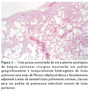Quando uma biópsia é realizada, a presença do padrão histopatológico de pneumonia intersticial usual (PIU) (Figura 2) em pelo menos um espécime é necessária para que se faça um diagnóstico definitivo de FPI.