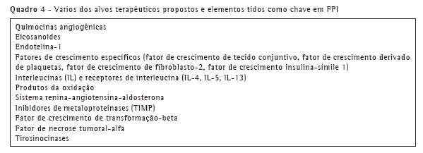 Vários mecanismos em potencial são considerados sítios apropriados para investigação e intervenção, incluindo: 1) diminuição da migração, proliferação e diferenciação dos fibroblastos pulmonares; 2) diminuição da síntese e deposição de matriz extracelular (MEC); 3) aumento da degradação da MEC depositada de maneira anômala; 4) intensificação da apoptose dos fibroblastos/miofibroblastos; 5) inibição da apoptose inadequada das células epiteliais alveolares; 6) intensificação da re-epitelização da membrana basal alveolar; 7) ruptura da MEC; e 8) modulação da atividade angiogênica. Dentro dessas vias, alvos moleculares específicos são fortes candidatos para modulação e incluem: o fator de crescimento transformador-beta (TGF-b ), a glutationa, o fator de necrose tumoral alfa (TNF-a), a endotelina e vários outros (Quadro 4).(34)