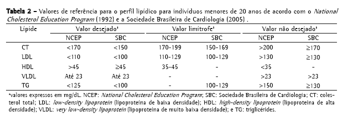 Não existe uma recomendação especifica para triagem e diagnóstico laboratorial da DFC. Por isto, as orientações e valores de referência são extrapolados das diretrizes da National Cholesterol Education Program, de 1992(36) e da Sociedade Brasileira de Cardiologia, de 2005(37) para crianças (Tabela 2); e das recomendações do Adult Panel III of the National Cholesterol Education Program(38) (Tabela 3) para adultos. Os valores de referência sugeridos pela Sociedade Brasileira de Cardiologia para indivíduos menores de 19 anos diferem daqueles da National Cholesterol Education Program, uma vez que propõem valores inferiores de CT, LDL e TG.