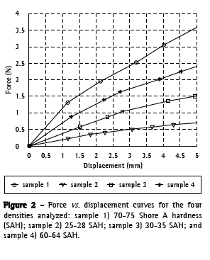 considering a contact area of 1 cm2, and a 30% reduction in diameter was calculated for each density. The best density was 70-75 Shore