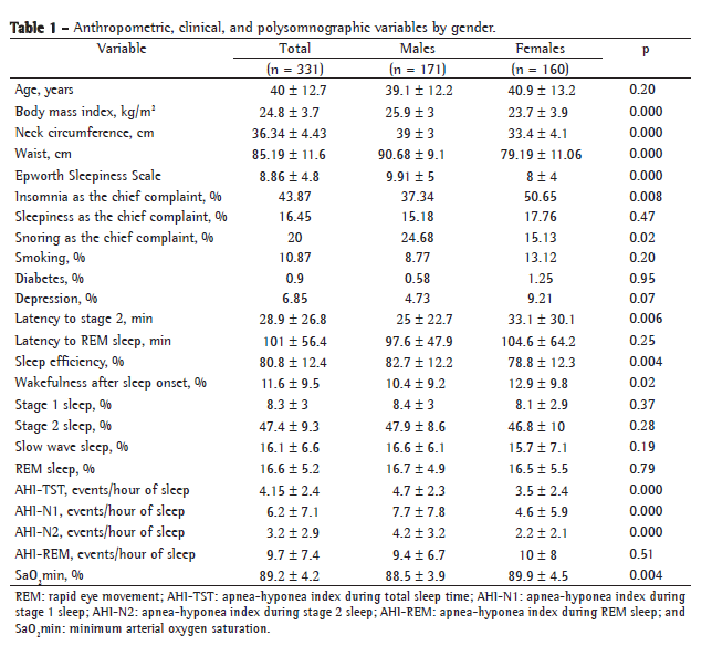 In this retrospective observational study, we stored selected patient and polysomnography data in computer files. The sample size was defined on the basis of data in the literature.(9) From January of 2000 to June of 2005, 3,973 patients (≥ 18 years of age), suspected of having sleep disorders, underwent clinical evaluation-including determination of body mass index (BMI)-and overnight polysomnography at the sleep laboratory of the Federal University of Rio Grande do Sul School of Medicine, in Porto Alegre, Brazil. After the desired sample size had been attained, we reviewed the database. We found the overall AHI to be < 10 in 1,456 patients. Among those patients, the clinical data were complete for 378, who were therefore eligible for inclusion in the study. We excluded 26 individuals who had not spent at least 30 min in REM sleep and in non-REM (NREM) sleep, as well as 21 individuals who had been taking anxiolytic, antidepressant or psychotropic substances. As can be seen in Table 1, the 331 cases selected presented the following characteristics: suspected OSAHS; AHI < 10; overnight polysomnography; and complete self-report data regarding sleepiness. The study was approved by the Human Research Ethics Committee of the Porto Alegre Hospital de Clínicas.