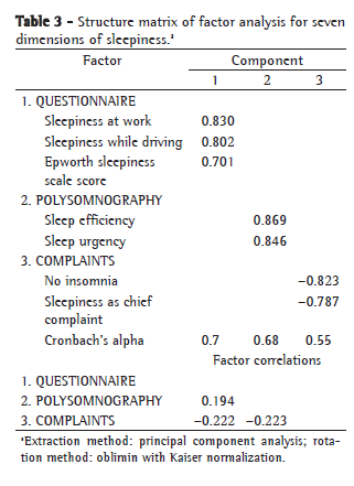 A factor analysis was performed using the seven sleepiness dimensions included in the reliability analysis. Of the factors derived from those seven variables, three presented an eigenvalue > 1 and were therefore included in the analyses. Those three factors explained 72% of the total sample variance. Correlations of the seven variables with each factor are shown in Table 3. The Kaiser-Meyer-Olkin statistic was 0.68, indicating good sampling adequacy. The first factor (QUESTIONNAIRE) correlated with the ESS dimensions "sleepiness at the wheel", and "sleepiness at work", with a Cronbach's alpha of 0.7. The second factor (POLYSOMNOGRAPHY) correlated with the polysomnographic variables: "sleep urgency" (the inverse of latency to stage 2) and "sleep efficiency", with a Cronbach's alpha of 0.68. The third factor (COMPLAINTS) correlated with the clinical interview variables "sleepiness as the chief complaint" and "insomnia as the chief complaint", with a Cronbach's alpha of 0.55.