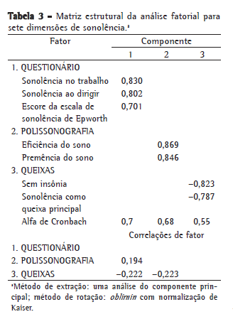 Foi realizada uma análise fatorial, usando as sete dimensões de sonolência incluídas na análise de concordância. Dos fatores derivados destas sete variáveis, três apresentaram um eigenvalue > 1 e foram, portanto, incluídos nas análises. Esses três fatores explicaram 72% da variância total da amostra. As correlações das sete variáveis com cada fator são mostradas na Tabela 3. A estatística de Kaiser-Meyer-Olkin foi de 0,68, indicando boa adequação da amostra. O primeiro fator (QUESTIONÁRIO) se correlacionou com as dimensões de ESE "sonolência à direção", e "sonolência no trabalho", com um coeficiente alfa de Cronbach de 0,7. O segundo fator (POLISSONOGRAFIA) se correlacionou com as variáveis polissonográficas: "premência de sono" (o inverso da latência para o estágio 2) e "eficiência do sono", com um coeficiente alfa de Cronbach de 0,68. O terceiro fator (QUEIXAS) se correlacionou com as variáveis da entrevista clínica "sonolência como queixa principal" e "insônia como queixa principal", com um coeficiente alfa de Cronbach de 0,55.