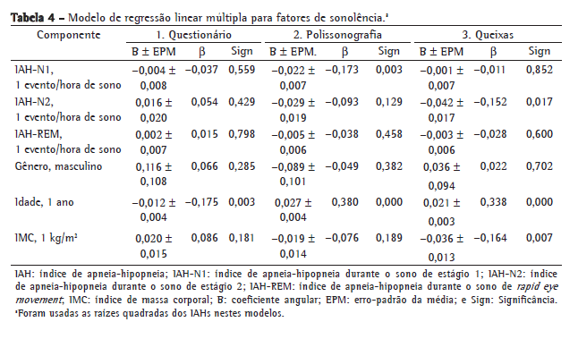 Os resultados da análise multivariada são mostrados na Tabela 4. Após o ajuste por gênero, idade e IMC, observamos que o IAH-N1 se correlacionou significativamente com o fator POLISSONOGRAFIA (β = −0,173, p = 0,003), o IAH-N2 se correlacionou significativamente com o fator QUEIXAS (β = −0,152, p = 0,017), e o IAH-REM não se correlacionou com nenhum fator.
