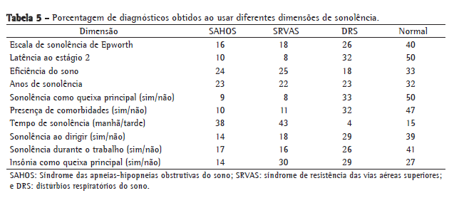 Usamos tabelas 2 × 2 para determinar o impacto que a mudança na dimensão de sonolência tem no diagnóstico de SAHOS. A insônia foi identificada com base em um critério diagnóstico semelhante ao usado na identificação da sonolência. A sonolência pela manhã/tarde foi considerada positiva para um diagnóstico de SAHOS quando era mais pronunciada pela manhã. Quando as quatro variáveis paramétricas foram utilizadas, a eficiência do sono > 85%, latência para o estágio 2 < 10 min, escore da ESE > 10 e anos desde o início da SED > 4 foram considerados indicativos de sonolência. Usando as dez dimensões de sonolência e os IAH para definir os quatro diagnósticos possíveis (Tabela 5), observamos que a porcentagem de casos com SAHOS variou entre 9% e 38%, em comparação a 8% e 43% para SRVAS, 4% e 33% para DRS e 15% e 50% para o diagnóstico normal.
