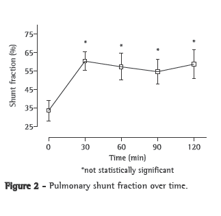 For decades, intravenous OA has been administered in order to mimic pulmonary embolism in animal models,(4) and, since the 1970s, it has been administered in models of ALI.(5) One group of authors(17) conducted a study involving 22 dogs, who were kept alive for seven days in order to evaluate the various stages of the pathophysiology of ALI. That study revealed that Qs/Qt and P(A-a)O2 returned to values close to baseline values by the end of the experiment. There was significant worsening of these variables on day 1 and subsequent improvement until day 7. A more recent study(18) revealed the resolution of the edema on day 7 after infusion of OA. Another group of authors(11) showed the evolution of respiratory, hemodynamic and gas exchange variables but did not assess the stability of the model. Those authors studied 8 dogs for 2.5 h and compared the variables using ANOVA with repeated measures. There was an indefinite increase in PAP and PVRI. The increase in pulmonary compliance, PVRI and P(A-a)O2 was designated as a recent event, as was the decrease in PaO2, CI and MAP. The increase in PAP, Qs/Qt and PaCO2 was treated as a late event. A study involving pigs(12) revealed stability of the model at 30 min for HR, PAP, Qs/Qt and dead space. In that study, ANOVA with repeated measures was also used in order to study the variables. In our study, MAP stabilized at t1, whereas HR, PAP and PCP showed a tendency toward stabilization at t2. Another group of authors(19) observed that those variables did not change during their study, which ensured the hemodynamic stability necessary for a model of ALI. The decrease and subsequent stabilization of the CI and gas exchange, as well as the increase in PVRI, are biologically plausible and accepted in the literature. It is likely that the decrease in myocardial contractility and the vascular lesion that are revealed by simple histological examination, despite there being no change in the wet-to-dry weight ratio, are responsible for the initial decrease in Qt.(20) Another important factor for the decrease in the CI is the vasoplegia that occurs in this model. In our study, we observed a decrease in the CI using thermodilution and an increase in PVRI without stabilization-results that are discordant with those found in the literature. Other authors(21) demonstrated that, in rabbit lungs, it is not the total PVRI that changes but rather the segmental distribution of resistances. It is likely that our methodology was the reason for the discrepancies between our results and those of other authors, and that, if there is hemodynamic stabilization, it will occur after the stabilization of respiratory and gas exchange properties. In our study, it was clear that the increase in MV was due to the significant increase in RR, since VT decreased. This determined the decrease in PaCO2 and the nonstabilization of pH. We were unable to measure respiratory system compliance or resistance due to the high RRs observed. However, W decreased in each respiratory effort due to the significant decrease in VT, although W/min increased throughout the experiment, suggesting a constant increase in compliance or airflow resistance and, therefore, in pulmonary impedance. When OA is administered, pulmonary compliance can increase up to three times in relation to its baseline value.(22) It is also known that there is an increase in airway resistance, measured by using various methods, due to the accumulation of secretion.(23) One group of authors(24) measured the wet-to-dry weight ratio in pigs and observed that this ratio increased significantly in the group that received OA, compared with the control group, which suggests worsening of compliance. Using forced oscillation, the authors of another study(25) demonstrated an increase in airway opening pressure, although without stabilization for up to 140 min. The principal events responsible for the increase in compliance are the accumulation of liquid in the alveolar and interstitial space and the increase in surface tension. Since Qs/Qt seems to correlate with the severity of the lesion, the extravasation of intra-alveolar fluid tends to decrease during the experiment. With a 0.09 mL/kg dose of OA, shunt values are higher than 40%.(26) Using 0.08 mL/kg, other authors(12) registered shunt values of up to 35%. Those authors also demonstrated the decrease in and the stabilization of PaO2 in the first 30 min, this condition persisting for 4 h. Another group of authors(27) found lower, basal fractions of Qs/Qt than those found in our study, approximately 15-20%. The dose used in the present study (0.15 mL/kg) explains the high Qs/Qt levels found. The 0.08 mL/kg dose of OA reduced the PaO2/FiO2 ratio from 451 to 139.(8)
