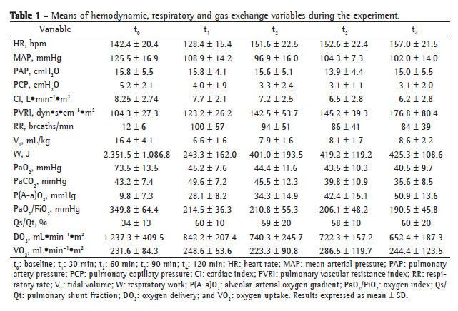 We are sure that, by increasing the number of animals, extending the study period and shortening the intervals between measurements of variables, we would gain a better understanding of the evolution and stability of hemodynamic, respiratory and gas exchange variables in OA-induced ALI. Forced oscillometry can assess respiratory mechanics in spontaneous ventilation more accurately, since, when the RR is high, it is not possible to perform end-inspiratory airway occlusion. The other techniques for measuring compliance and airflow resistance would require maneuvers that could change hemodynamic parameters, which would not be desirable in this case.