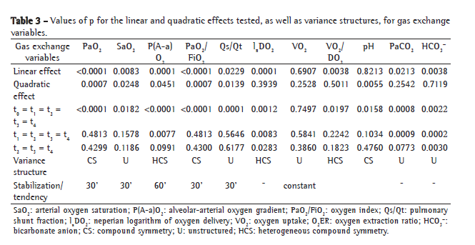 The results were presented as mean ± SD. The null hypothesis was that the means of hemodynamic, respiratory and gas exchange variables were similar at t0, t1, t2, t3 and t4. The possibility that the means of the variables at t0 were different from those at the other time points and that the latter were similar to one another was the most plausible, which would signify stability after t1 or t2. The methodology used had a repeated measure design. In order to determine whether a polynomial, a linear or a quadratic function reasonably fit the data, an analysis of linear or quadratic tendency was performed. As a result, if the data fit only the linear effect, the mean of the variable would increase or decrease over time, and there would therefore be no stabilization. If solely the quadratic effect fit the data, the mean of the variable would increase or decrease up to a certain time point and would subsequently decrease or increase from that point onward.
