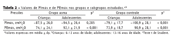 No grupo controle, os valores de força respiratória máxima (PImáx e PEmáx) foram maiores nos adolescentes quando comparados aos das crianças (p < 0,001). No grupo asma, os adolescentes apresentaram maior valor de PEmáx quando comparados aos das crianças (p < 0,001; Tabela 2), mas o mesmo não ocorreu com PImáx.
