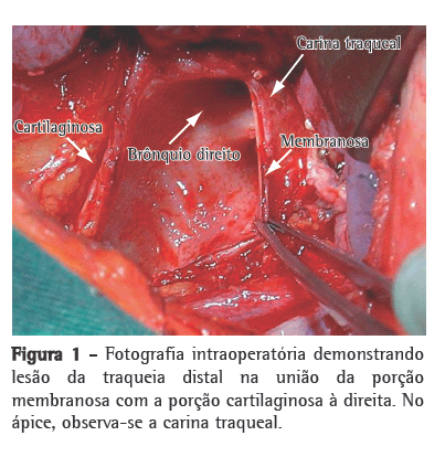 Foi submetida à toracotomia póstero-lateral direita, e foi visualizada uma laceração de 80 mm de comprimento da traqueia distal, na união da porção membranosa com os anéis traqueais, e com extensão para o brônquio principal direito (Figura 1). Realizou-se o fechamento primário com sutura contínua com fio de polidioxanone 4-0 com interposição de retalho de pleura parietal. Foi extubada após 24 h. A fibrobroncoscopia no quarto dia pós-operatório mostrava traqueia pérvia e linha de sutura em bom estado. Apesar da correção da laceração traqueal, a paciente evoluiu com sepse pulmonar, choque e falência de múltiplos órgãos e sistemas, com óbito no oitavo dia pós-operatório.