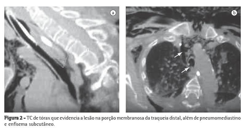 Paciente feminina, 61 anos, com antecedente de hipertensão arterial e insuficiência renal crônica, foi admitida com história de rebaixamento de nível de consciência e insuficiência respiratória secundária a acidente vascular cerebral. Foi sedada e submetida à intubação na sala de emergência, com relato de múltiplas tentativas e bastante dificuldade de acesso à via aérea. Foi encaminhada para a unidade de terapia intensiva, onde foi mantida sedada e em ventilação mecânica com baixas pressões, mas evoluiu com hemoptise e enfisema subcutâneo e mediastinal na radiografia de tórax. Foi realizada fibrobroncoscopia, com evidência de laceração da parede membranosa no terço proximal de traqueia cervical, de aproximadamente 3 cm de extensão e distando 4 cm das cordas vocais. Não havia sangramento ativo aparente, apenas coágulos, que foram aspirados. Optou-se por tratamento conservador devido ao quadro neurológico agudo da paciente, sendo posicionado por endoscopia o tubo orotraqueal com o balonete distal à lesão, e foi introduzido antibiótico com cobertura para germes da árvore traqueobrônquica. Evoluiu com melhora progressiva do enfisema subcutâneo. Foi realizada nova broncoscopia no oitavo dia pós-intubação, que mostrou cicatrização completa da lesão com tratamento expectante, ocasião em que foi realizada traqueostomia cervical devido ao comprometimento neurológico da doença de base.