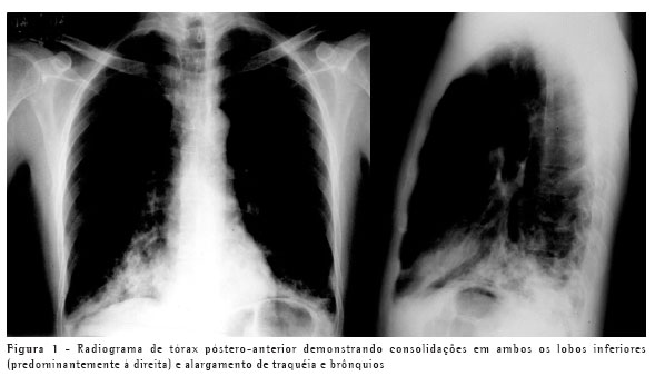 Um paciente do sexo masculino, de 40 anos, cor negra, foi encaminhado ao ambulatório de pneumologia por fadiga aos esforços e tosse seca persistente, três semanas após ter recebido alta de uma internação hospitalar para tratamento de uma pneumonia. Havia apresentado, 40 dias antes, febre de início súbito, tosse produtiva com hemoptise de pequena quantidade (raias), e dispnéia. Recebeu o diagnóstico de pneumonia e foi internado, tendo recebido cefazolina intravenosa por sete dias, com boa evolução. Referia ainda três episódios prévios de pneumonia, o primeiro quando com 22 anos de idade. O radiograma de tórax realizado no momento da avaliação evidenciava consolidações discretas no lobo médio, de aspecto residual, além de aumento importante do diâmetro traqueal e dos brônquios principais. Realizou tratamento empírico com broncodilatador, sem resultado, por duas semanas, quando então retornou para reavaliação. A tosse havia piorado e passou a ser produtiva. O radiograma de tórax neste momento evidenciou novas consolidações, em ambos os lobos inferiores e no lobo médio. Não havia alteração nos sinais vitais e o paciente encontrava-se em bom estado geral. Recebeu prescrição de eritromicina via oral por dez dias. Nos primeiros três dias houve melhora da tosse e da fadiga e, ao final dos dez dias, a tosse havia melhorado quase completamente.