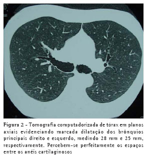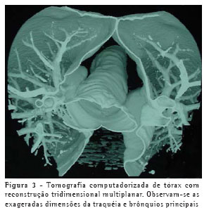 Poucos dias após o término do curso do tratamento com eritromicina, entretanto, o paciente voltou a apresentar tosse produtiva, associada a febre, e o radiograma não evidenciou melhora das consolidações. Foi novamente internado e realizou-se bacterioscopia de escarro, que evidenciou inúmeros polimorfonucleares e cocos gram-positivos em abundância. Cultura não era disponível. Iniciou tratamento com oxacilina intravenosa, obtendo resposta clínica satisfatória em poucos dias, motivo pelo qual foi iniciada a administração de cefalexina por via oral. Voltou a apresentar febre após 48h de uso de cefalexina via oral, o que motivou retorno para tratamento intravenoso e transferência para hospital de maior complexidade para investigação etiológica mais elaborada. O novo exame bacterioscópico de escarro neste momento evidenciou flora polimicrobiana e o paciente iniciou o uso de ceftriaxona associada a amicacina, com duração total de quatro semanas de tratamento, até a total resolução dos sintomas. Neste momento, foi realizada uma tomografia computadorizada de tórax, que demonstrou persistência das lesões consolidativas, de menor tamanho, em ambos os lobos inferiores, e confirmou o alargamento anormal da traquéia e brônquios principais (Figuras 1, 2 e 3), com bronquiectasias cilíndricas bilaterais nos lobos inferiores, caracterizando o diagnóstico de traqueobroncomegalia congênita, ou síndrome de Mounier-Kühn. As provas de função pulmonar evidenciaram aumento da capacidade pulmonar total (123% do previsto) e do volume residual (160% do previsto), sem outras alterações.