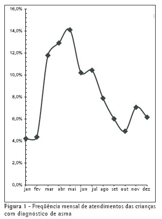 Na Figura 1 encontra-se a freqüência mensal de atendimentos das crianças com diagnóstico de asma, que variou de 4% a 14%, onde se verifica que ela é maior nos meses de março, abril e maio (período chuvoso) e menor nos meses de julho, agosto, setembro e outubro (período seco).