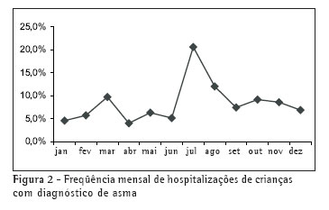 A Figura 2 mostra a freqüência mensal de atendimentos das crianças estudadas com diagnóstico de asma e que necessitaram de tratamento hospitalar, a qual variou entre 5% e 20%, com maior percentual de internações nos meses de julho, agosto e setembro (período seco).