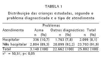 Na Tabela 1 vê-se a distribuição das crianças estudadas, segundo o diagnóstico do problema (agravo) e o tipo de atendimento (hospitalar ou não), e observa-se que a taxa de hospitalização por asma foi de 1,3% (336/25.802). Dentre as crianças com diagnóstico de asma, 10,7% (336/3.140) necessitaram de tratamento hospitalar, enquanto que para outros diagnósticos o percentual foi de 7,8% (1.763/22.662), diferença esta estatisticamente significativa (p = 0,01).