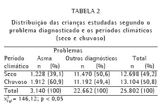 Na Tabela 2 encontra-se a distribuição das crianças estudadas, segundo o período climático (seco ou chuvoso) e o problema diagnosticado. Nota-se que 60,9% dos diagnósticos de asma (1.912/3.140) e 49,4% dos outros diagnósticos (11.192/22.662) ocorreram no período chuvoso, sendo as diferenças estatisticamente significativas (p < 0,05).