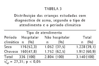 A distribuição das crianças estudadas com dia-gnóstico de asma, segundo o tipo de atendimento (hospitalar ou não) encontra-se na Tabela 3. Comparando-se o tipo de atendimento, hospitalar ou não hospitalar, nota-se que ocorreram mais hospitalizações entre as crianças com diagnóstico de asma no período seco, 52,5% (176/336), em relação ao chuvoso. Por outro lado, observa-se o contrário com relação às crianças com diagnóstico de asma e que tiveram somente o atendimento não hospitalar: período seco com 37,5% (1.052/2.804) e chuvoso com 62,5% (1.752/2.804), diferenças estatisticamente significativas (p < 0,05).