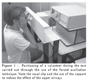 During the FOT tests, the individuals remained in a sitting position and used a nose clip, supporting their cheeks and chin with their hands while breathing calmly through the use of a mouthpiece. The coherence function used for the acceptance of the tests was set at a minimum of 0.9.(10-11) Figure 1 shows an illustrative photo of a volunteer engaged in the FOT test.