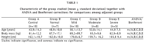 Figure 2 shows the results of the theoretical percentages of FEV1, FEV1/FVC and FEF/FVC for the groups studied. We observed significant percentage reductions in FEV1 (ANOVA, p < 0.0001), FEV1/FVC(%) (ANOVA, p < 0.0005), and FEF/FVC (ANOVA, p < 0.0001).