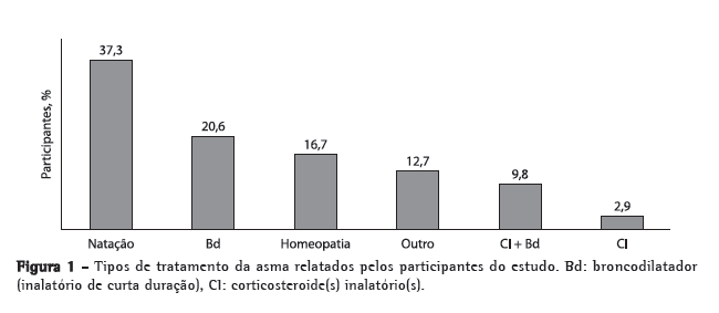 Dos 223 nadadores que relataram asma ou bronquite alguma vez na vida (questão 8), apenas 102 (45,7%) relataram algum tipo de tratamento: natação foi o "tratamento" mais frequente (37,3%) e apenas 12,7% utilizavam corticosteroides inalatórios (Figura 1).