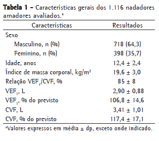 Embora não se tenha podido determinar o número real de participantes, considerando-se que 4.014 nadadores foram inscritos na competição de natação, 1.116 (27,8%) preencheram o questionário e realizaram a espirometria de repouso. Esse tamanho amostral foi o maior que pôde ser obtido por nossa equipe. Nosso objetivo foi avaliar pelo menos 25% dos nadadores que participaram da competição (definido durante o delineamento do estudo), então atingimos o tamanho amostral pretendido. Como pode ser visto na Tabela 1, a maioria dos nadadores era do sexo masculino, tendia a ser magra (índice de massa corporal médio: 19,6 kg/m2) e apresentava função pulmonar normal. A média de idade dos participantes era de 12,4 ± 2,4 anos, e os participantes estavam igualmente distribuídos na faixa etária estudada.
