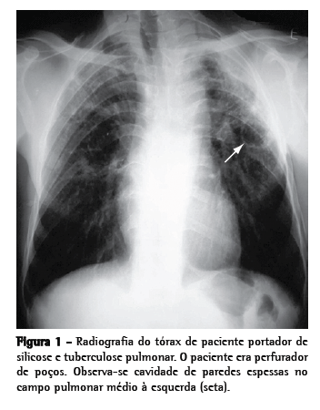 A associação entre silicose e tuberculose tem sido estudada desde o início do século passado.(7) O risco de portadores da silicose em desenvolver tuberculose pulmonar-comparados a controles sadios-variou entre 2,8 e 39 vezes.(4,7-10) O risco para o desenvolvimento de tuberculose extrapulmonar em silicóticos também é aumentado, chegando a 3,7 vezes.(9,11) As formas mais comuns são a pleural-responsável por 61% dos casos(11)-a pericárdica e a linfonodal.(9) Quanto à relação entre as micobacterioses e as diferentes formas da silicose, estudos da literatura internacional observaram uma incidência maior nas formas aguda e acelerada.(12) Em nosso meio, relatou-se recentemente uma prevalência de tuberculose pulmonar de 52% em pacientes com silicose em sua forma de fibrose maciça progressiva. A maioria destes casos foi diagnosticada por baciloscopia ou cultura do escarro.(13)