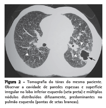 Têm sido reconhecidos também padrões sugestivos de silicotuberculose na TC de tórax. Os principais achados compatíveis com tuberculose ativa sobreposta à silicose são cavitações de paredes espessadas, consolidações, imagens com aspecto de árvore em brotamento, assimetria das imagens nodulares e progressão rápida da doença(26,28,29) (Figura 2).