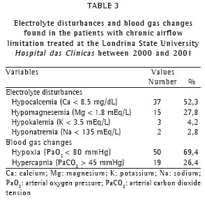 Objective: To determine the relative frequency of hypomagnesemia among patients with chronic airflow limitation treated as outpatients at a referral center in the northern part of the state of Paraná between 2000 and 2001, as well as to determine whether hypomagnesemia correlates with hypoxia, with other electrolyte disturbances and with the severity of airflow limitation. Methods: This was a descriptive study of the relative frequency of hypomagnesemia in 72 patients with chronic airflow limitation. All of the patients were submitted to blood tests to determine serum levels of magnesium and other electrolytes, as well as to staging of the underlying disease. Results: The prevalence of hypomagnesemia was 27.8%. The mean age was 65 ± 9.9 years, and there was a predominance of males. The mean forced expiratory volume in one second was 1.31 ± 0.52 L. Most of the patients (68.1%) were found to be in the advanced stages of the disease. Hypomagnesemia was not found to correlate with other electrolyte disturbances, hypoxemia or disease stage. Conclusion: The high frequency of patients in the advanced stages is likely attributable to the fact that the outpatient facility is a referral center for the region. Further studies should be conducted in order to determine the probable causes of this high prevalence of hypomagnesemia.