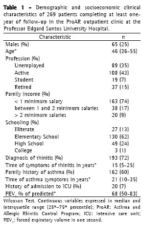 In the period from January of 2003 to September of 2004, 315 patients were admitted. A total of 17 patients were excluded from this analysis due to insufficient data in their records, 22 patients abandoned the program, and 7 patients died before completing the one-year follow-up period. A total of 269 patients completed the study. As can be seen in Table 1, the median age of the patients included was 46 years (range, 36-55 years), and there was a predominance of females. Most patients were unemployed, with low family income and limited schooling. A diagnosis of rhinitis was made in 72% of the patients, and the median duration of the symptoms of rhinitis was 15 years (range, 5-25 years). The duration of asthma symptoms was also long (median, 21 years; range, 10-35 years), and 60% of the patients had a family history of asthma. The median forced expiratory volume in one second was 68% of predicted (range, 50-83%).