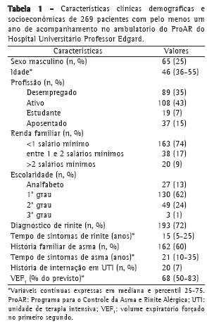 No período de janeiro de 2003 a setembro de 2004 foram admitidos 315 pacientes. Foram excluídos da análise 17 pacientes por possuírem registro insuficiente de dados, 22 pacientes abandonaram o programa e 7 pacientes faleceram antes de um ano de acompanhamento. Completaram o estudo 269 pacientes. A Tabela 1 indica que a mediana de idade dos pacientes incluídos foi de 46 anos (36 a 55), com predomínio do sexo feminino. A maior parte dos pacientes era de desempregados, com baixa renda familiar e baixa escolaridade. O diagnóstico de rinite ocorreu em 72% dos pacientes, e a mediana do tempo de sintomas de rinite foi de 15 anos (5 a 25). O tempo de sintomas de asma também foi elevado, com mediana de 21 anos (10 a 35), e 60% dos pacientes tinham história familiar de asma. A mediana de volume expiratório forçado no primeiro segundo foi de 68% do previsto (50% a 83%).