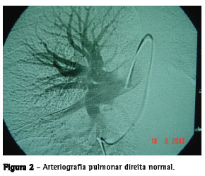 Paciente do sexo feminino, 40 anos, era oligossintomática com dor torácica incaracterística há 20 anos, referindo que a mesma aparecia cerca de uma vez por mês, com aperto no hemitórax direito, com algumas horas de duração, e que algumas vezes era acompanhada de dispnéia. O raio X de tórax revelou uma imagem hipotransparente à direita. A tomografia computadorizada mostrou imagem com cerca de 3 cm de diâmetro, com íntima relação com a artéria pulmonar, não afastando origem vascular do nódulo (Figura 1).
