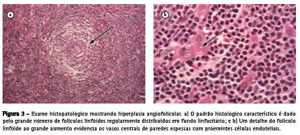 Atualmente, são reconhecidas três variáveis histológicas: hialino-vascular, a mais freqüente (90% dos casos); plasmocitária (8 a 9% dos casos); e mista (1 a 2% dos casos). O presente caso é do tipo hialino-vascular, caracterizando-se pela presença de numerosos folículos linfóides, regularmente distribuídos em fundo linfocitário. Os folículos linfóides apresentam uma periferia de linfócitos maduros e com o centro composto por células com núcleos grandes, vesiculosos, circundando um ou mais vasos sanguíneos, com paredes espessas e células endoteliais tumefeitas. Material eosinofílico semelhante a colágeno hialinizado também está presente ao redor dos vasos, em caráter concêntrico.(2)