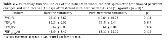 In 34 (35%) of the 96 study participants, S1 revealed pulmonary function impairment. In 8 (8.3%), pulmonary function values did not return to the normal range even after the 10-day course of treatment (use of an oral corticosteroid in combination with a 2 agonist), constituting evidence of treatment-resistant pulmonary function impairment. In this subgroup of patients (n = 8), the mean age was 12.0 ± 2.1 years, and there was a predominance of the following: moderate and severe cases (87.5% vs. 72.0% in the sample as a whole); history of hospitalization for AVB (87.5% vs. 66.0%); and atopy (100% vs. 92.0%). The small number of patients with persistent pulmonary function impairment limits the statistical analysis of these results. Comparing only the baseline values (before bronchodilator testing) found in those patients after the initial tests (S1) with those found after the course of treatment with a corticosteroid (S2), we found no significant differences in the pulmonary function indices. The pulmonary function values of the patients with irreversible loss of pulmonary function are shown in Table 2.